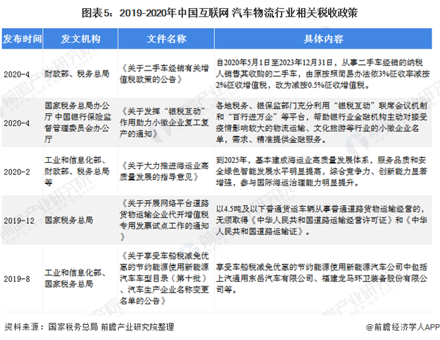 在稅收方面,國家政策對于汽車行業(yè)給予較大支持。2020年4月,《關(guān)于二手車經(jīng)銷有關(guān)增值稅政策的公告》指出,自2020年5月1日,二手車經(jīng)銷減按0.5%征收增值稅。二手車稅收的減征將有利于二手車銷售,推動二手車汽車物流發(fā)展?!蛾P(guān)于開展網(wǎng)絡(luò)平臺道路貨物運(yùn)輸企業(yè)代開增值稅專用發(fā)票試點(diǎn)工作的通知》指出以4.5噸及以下普通貨運(yùn)車輛從事普通道路貨物運(yùn)輸經(jīng)營的,無須取得運(yùn)輸經(jīng)營許可證和道路運(yùn)輸證,一系列稅收和程序便利化政策推動網(wǎng)絡(luò)平臺道路貨物運(yùn)輸企業(yè)發(fā)展。